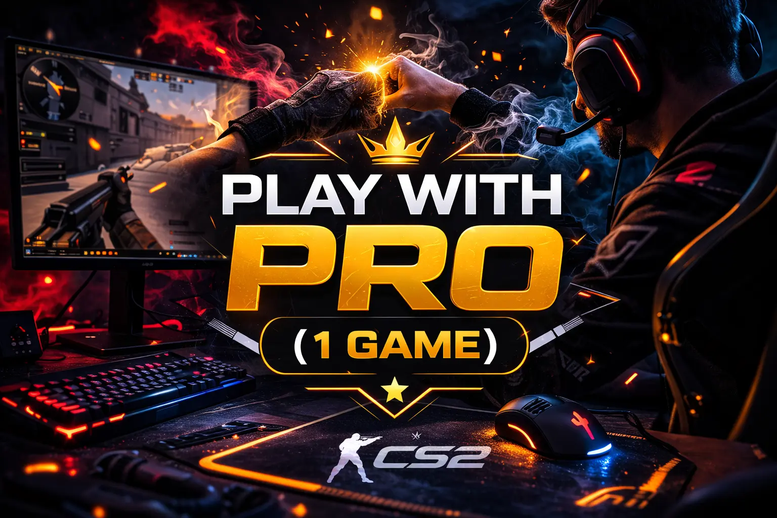 Play With Pro allows you to play a Counter-Strike 2 match together with a high-rank professional player. Instead of boosting your account directly, the pro player joins your team and helps you win the game while you play alongside them.